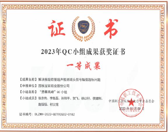 2023年,公司積極踐行“走出去”戰略,相繼參加了陜西省、有色金屬行業、中國職工技術協會、國核鈾業組織的QC小組成果發布交流活動,共榮獲特等獎1項、一等獎2項、二等獎2項、三等獎1項、優秀獎5項。后續,公司將持續推進質量管理小組活動的深入開展,進一步提高基層員工參與質量、貢獻質量的積極性、主動性和創造性,再出新成果,再創新佳績。