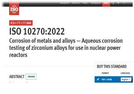 ▲公司制修訂ISO10270:2022《金屬和合金腐蝕—核反應堆用鋯合金水溶液腐蝕試驗》國際標準